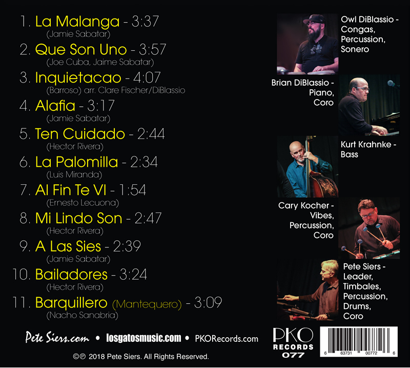 Owl DiBlassio's (congero/sonero) lead vocals are honest and effortless; his tenor voice is unique - no copycat, here. Cary Kocher fluently expounds upon the Cal Tjader vibraphone lexicon; Cary also brings his own breath-taking improvisations to the festivities. Pianist Brian DiBlassio displays his expert proficiency and understanding of montuno patterns, syncopating them in his own style to shape and lift the music. Kurt Krahnke channels the legendary Cuban bassist Cachao as he rocks the bottom of the band with a Detroit-centric vibe. Leader Pete Siers is a genuine master timbalero. Although he was born in Saginaw, Michigan, Pete sounds as if he came from Havana, Cuba! His amazing natural feel and sound come from his life-long study and love of this music.